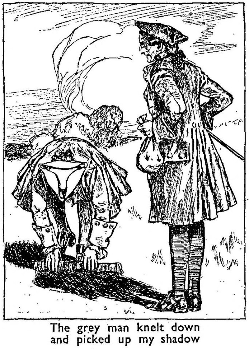 "The grey man knelt down and picked up my shadow."  From The Children's Newspaper, 1938.