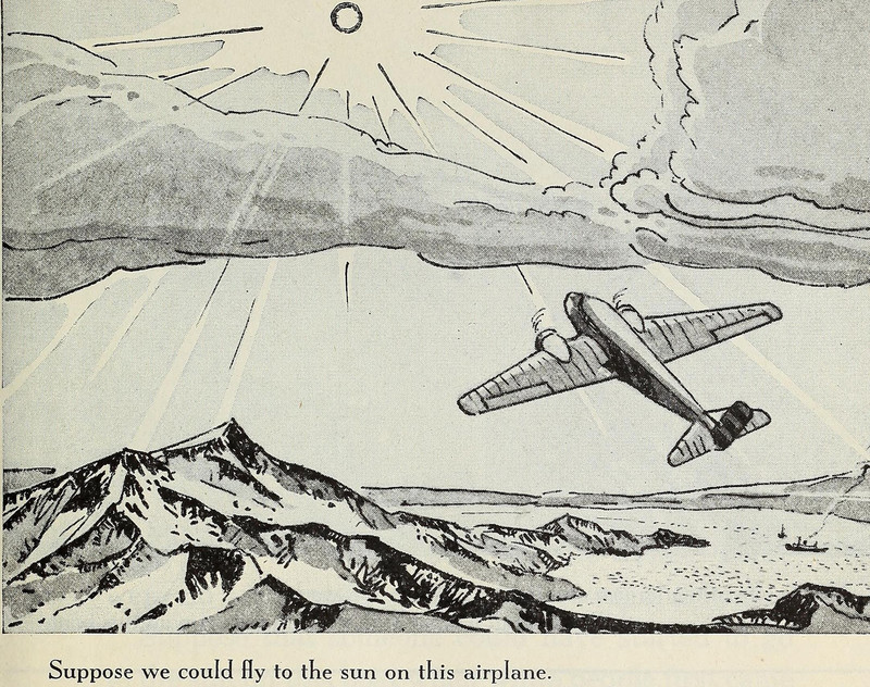 "Suppose we could fly to the sun on this airplane."  From Our Earth and Sky by Gerald Craig and Sara Baldwin, 1940.