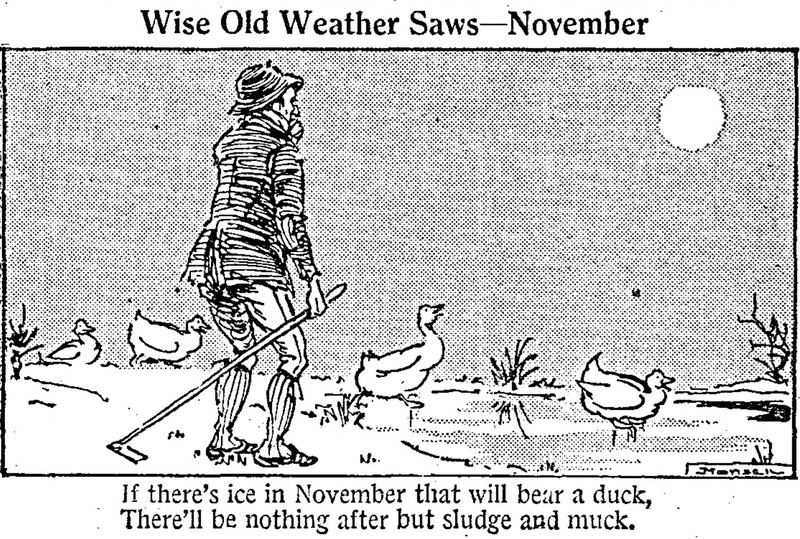"If there's ice in November that will bear a duck, there'll be nothing after but sludge and muck."  From The Children's Newspaper, 1924.