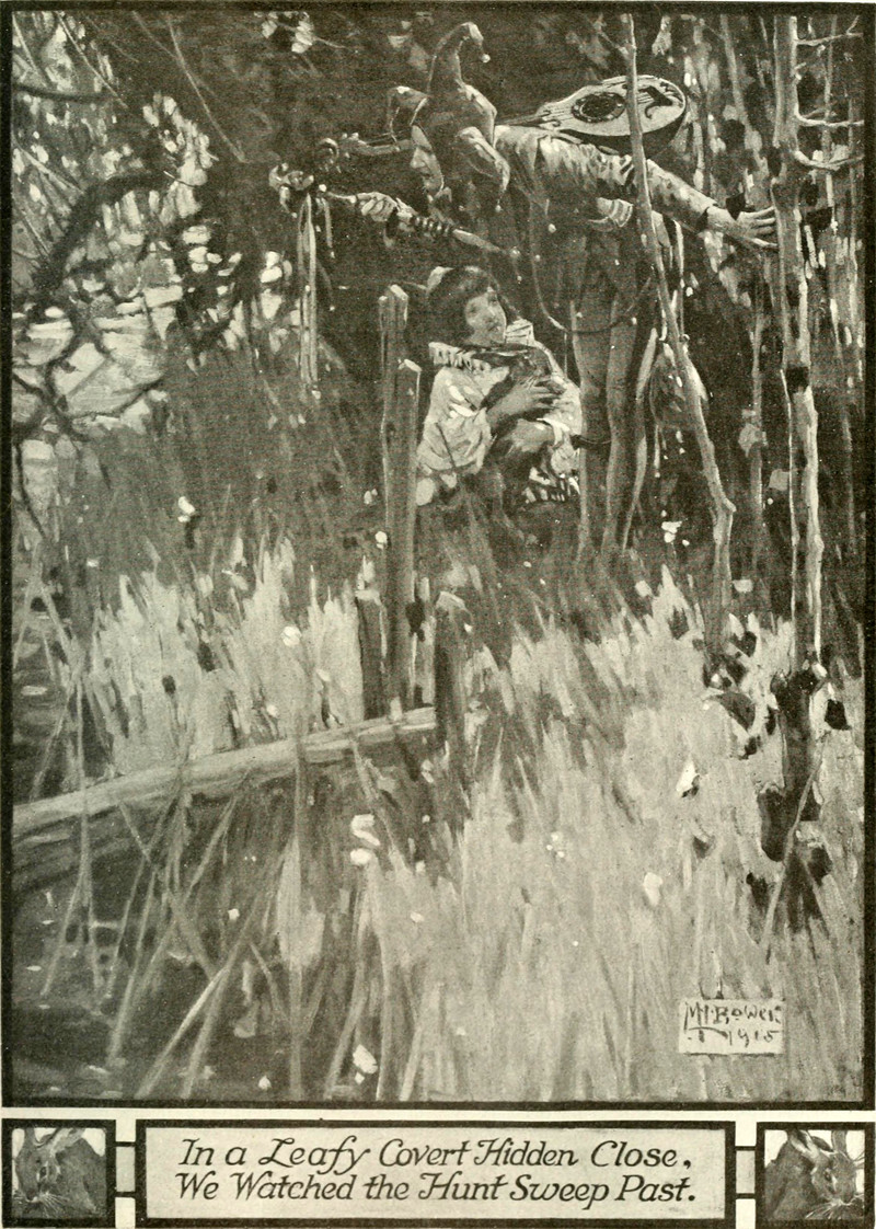 "In a leaft covert hidden close, we watched the hunt sweep past."  From St. Nicholas magazine, 1916.