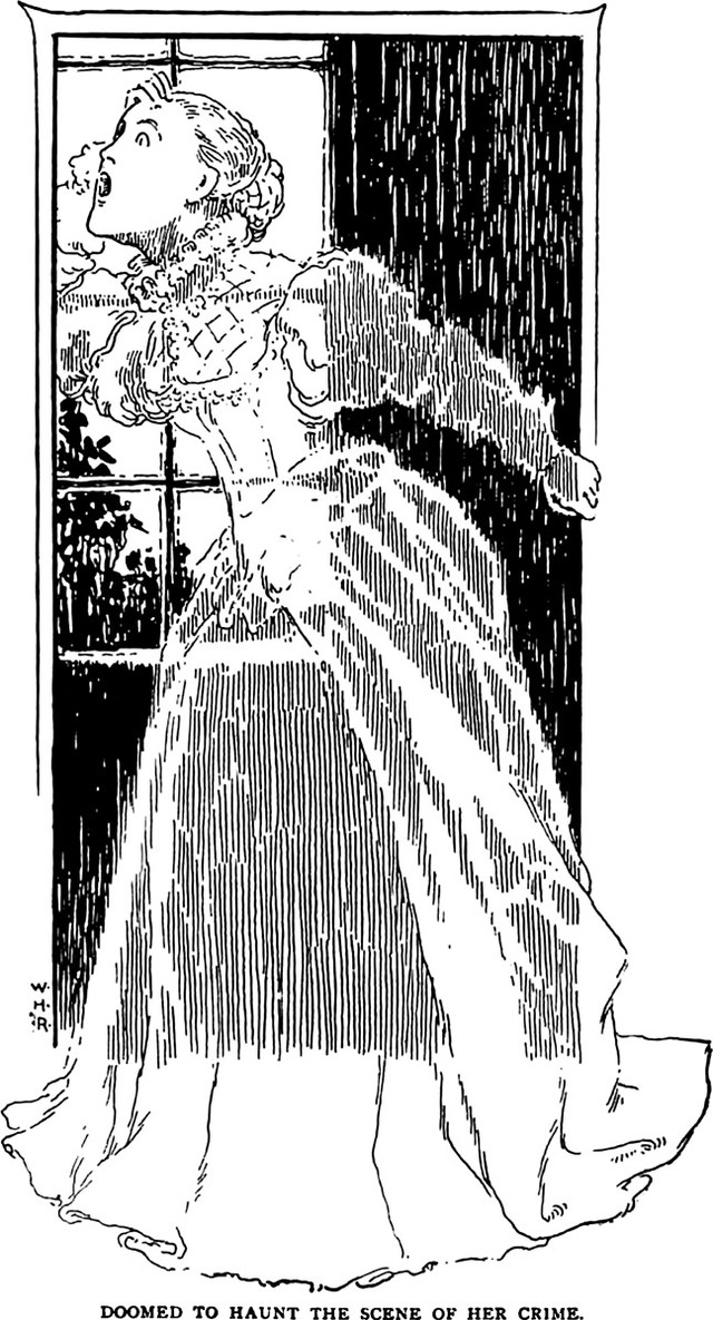 An illustration from a 1904 issue of The Reader magazine. The caption reads: "Doomed to haunt the scene of her crime."