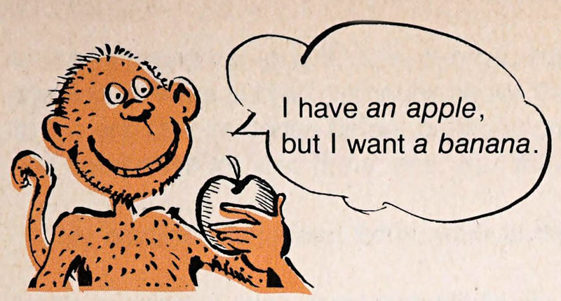 "I have an apple, but I want a banana."  From Starting Points in Language A, Skills Practice Book, Teacher's Edition by Raisbeck & Smart, 1980.