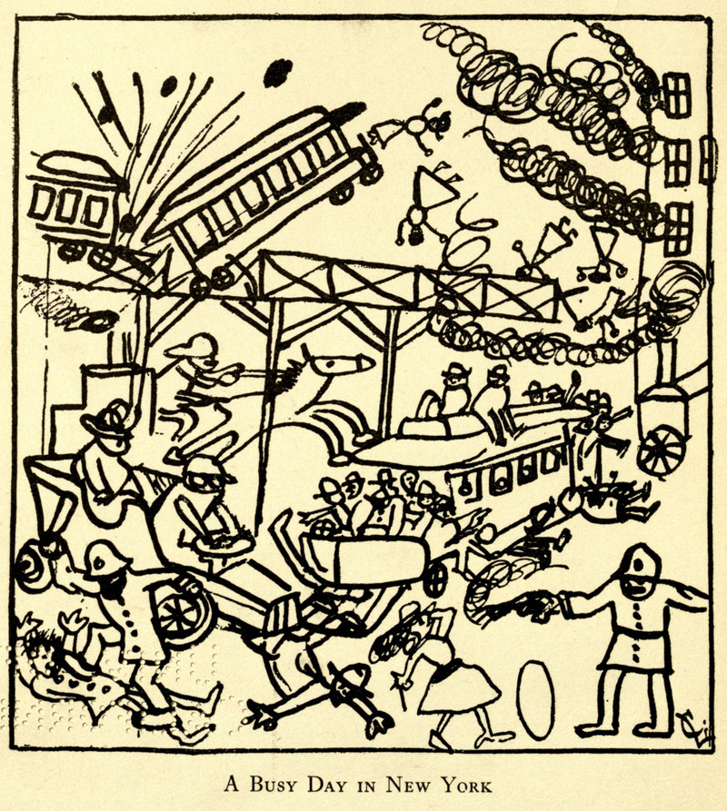 "A busy day in New York."  From The Simple Jography by Oliver Herford, 1908.