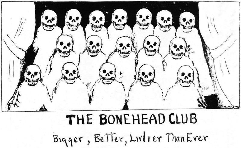 "The Bonehead Club: bigger, better, livlier than ever."  From the University of Arkansas' 1917 yearbook.