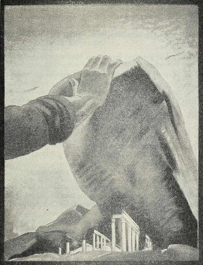 #vintage illustration #giant #giant hand #archaeology #roman #illustration #under a cloud #under a rock