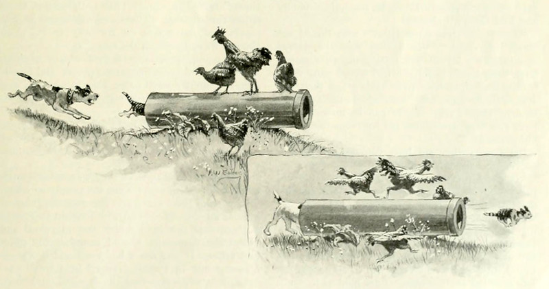 #vintage illustration #chased #rooster #illustration #dog and cat
