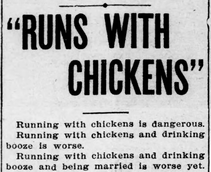 "Runs with chickens."  From The Duluth Herald, 1913.
