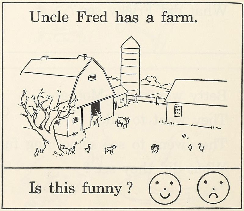 Would it be funny if Uncle Fred couldn't tell a yam from a sweet potato, was allergic to livestock, lacked a green thumb, and had no management skills? From My Do and Learn Book To Accompany The Little White House by Ousley & Russell, 1948.