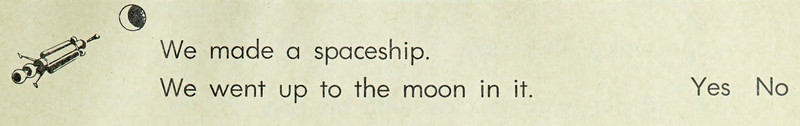 "We made a spaceship. We went up to the moon in it. Yes, No." From My Practice Book For Me Level 2 by Thorn, McCreary-Juhasz, Smith, Munroe & Richmond, 1966.