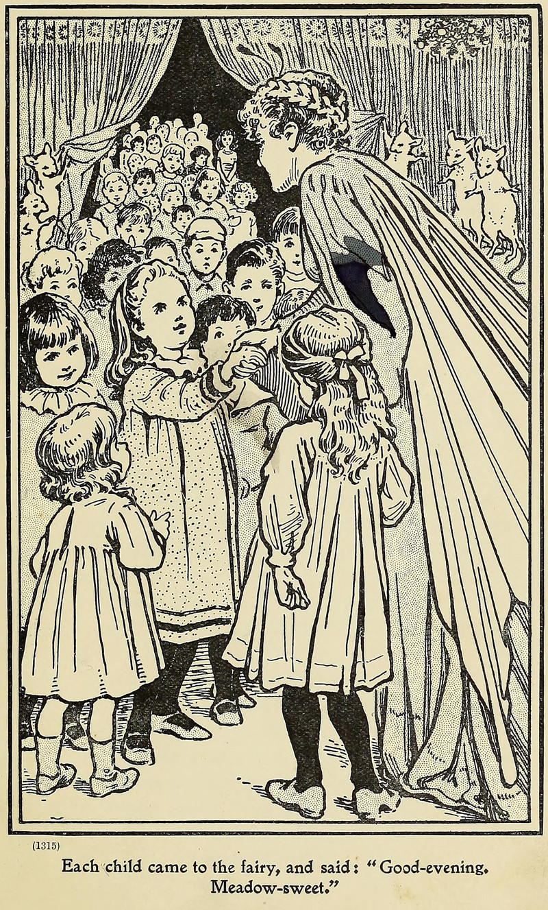 "Each child came to the fairy, and said: 'Good -evening, Meadow-sweet." From The Garden of Childhood by Alice M. Chesterton and illustrated by Gertrude M. Bradley, 1905.