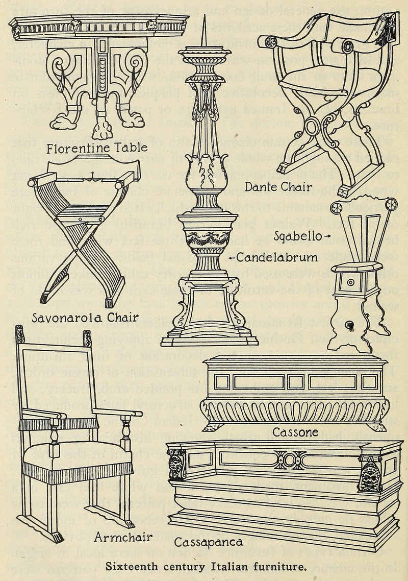 "Sixteenth century Italian furniture."  From Elements of Interior Decoration by Augustus Sherrill Whiton, 1944.