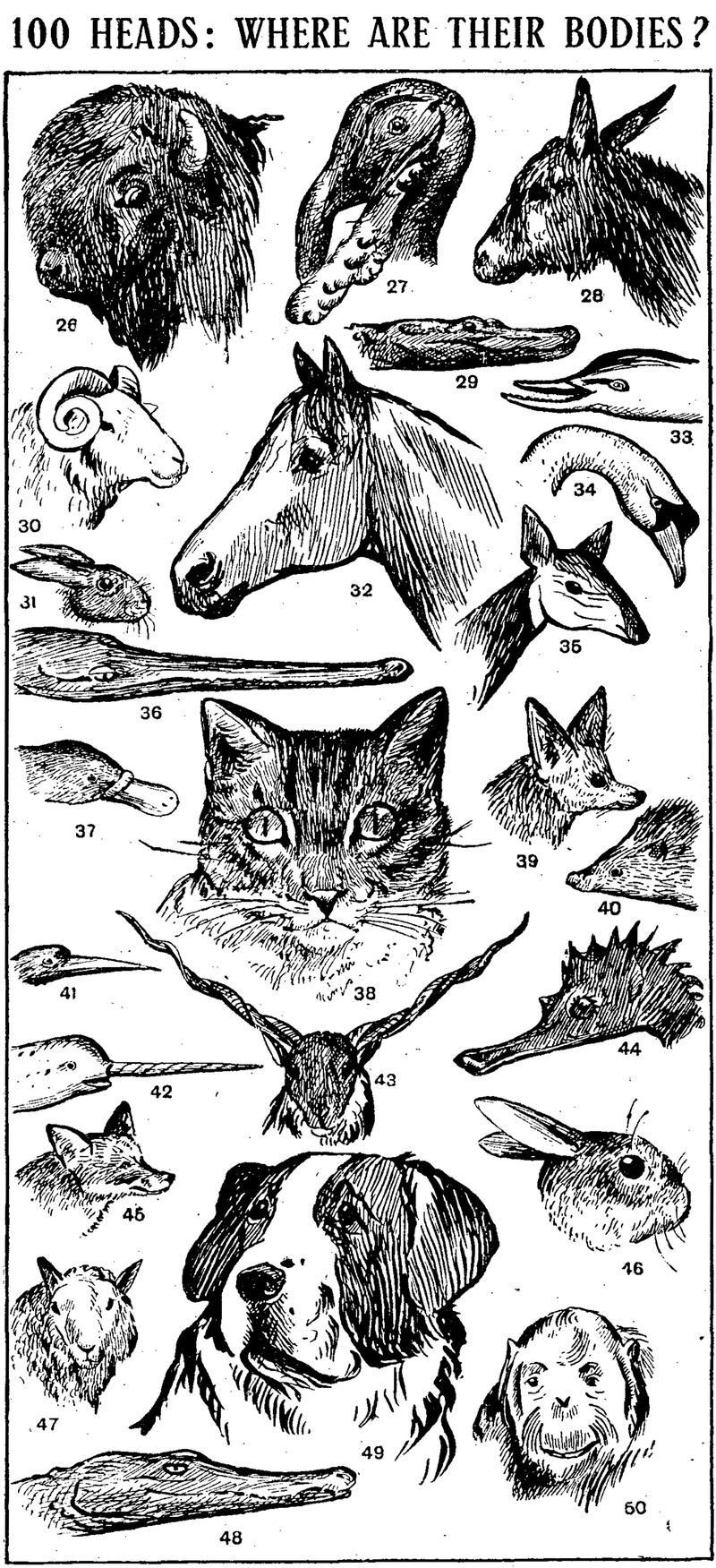 "100 heads: where are their bodies?"  From The Children's Newspaper, 1925.
