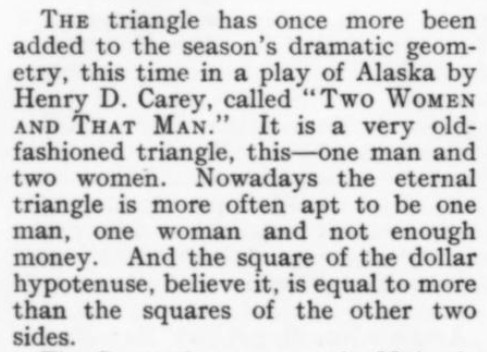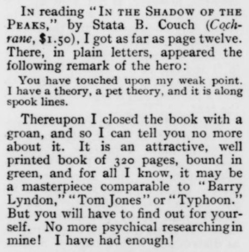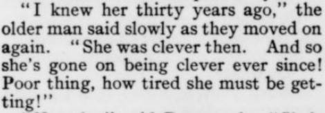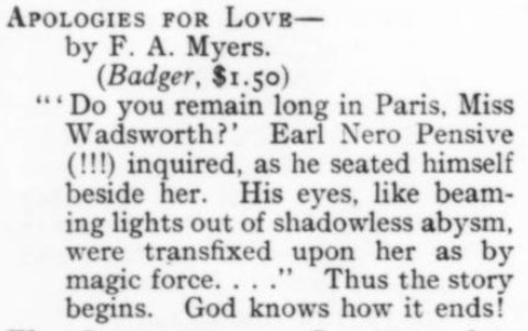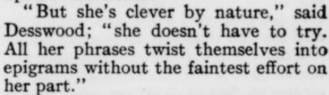 ***[Gelett Burgess says, in comparing a character to a portrait of the same character]When the real smile came the picture receded to its frame, sighed and fell asleep.***The air [around the Flatiron Building] was an arrant madcap that day; it blew in six directions at once, like an intoxicated tornado. [Burgess]***She laughed for a full minute by the clock, then reeled to a chair and laughed again. [Burgess]***Mrs. Braxton-Burlap [Burgess]***elaborate epigrams, as carefully worded as a mortgage [H. L. Mencken]***If this dramatists continue playing on New York life much longer, New York life will need a piano tuner to get it back into shape again. [George Jean Nathan]***It is, in brief, not half so bad as the publisher's encomiums lead you to expect. [Mencken]***[The play's] atmosphere is so penetratingly realistic that it makes one feel like putting on a verisimilitude overcoat. [Nathan]***