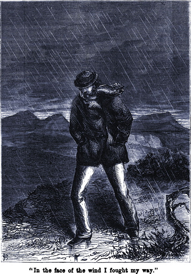 An illustration from an 1870 issue of The Quiver magazine.  The caption reads: "In the face of the wind I fought my way."
