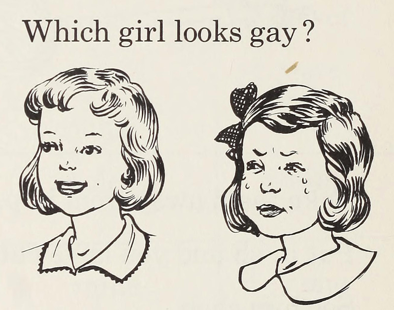 "Which girl looks gay?"  From Practice for Up and Away by McKee, Harrison, McCowen & Lehr, 1957.