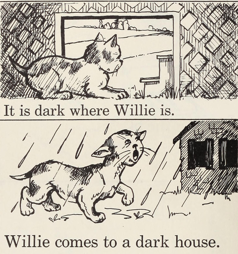 "It is dark where Willie is.  Willie comes to a dark house."  From Practice for Up and Away by McKee, Harrison, McCowen & Lehr, 1957.