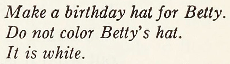 "Do not color Betty's hat. It is white." From Manual for Teaching the Primer The Little White House by Russell & Ousley, 1948. Related: The Minimalist Coloring Book.