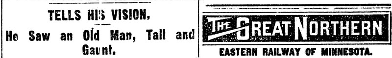 Two Twin Peaks precursors on the same page -- a vision of an old, tall, gaunt man (as character Dale Cooper had) and a reference to The Great Northern. From the Duluth Herald, 1900.