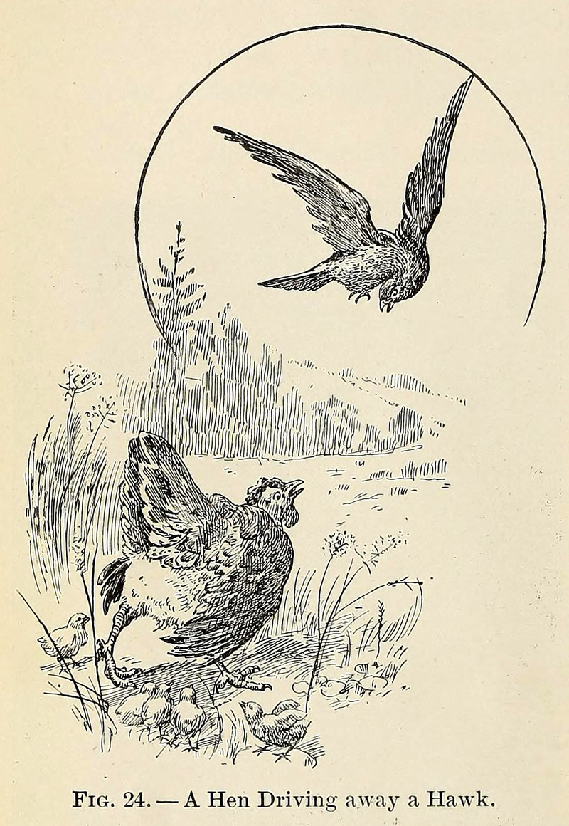 Hen versus hawk: which do you wager to win?  From Mother Nature's Children by Allen Walton Gould, 1900.