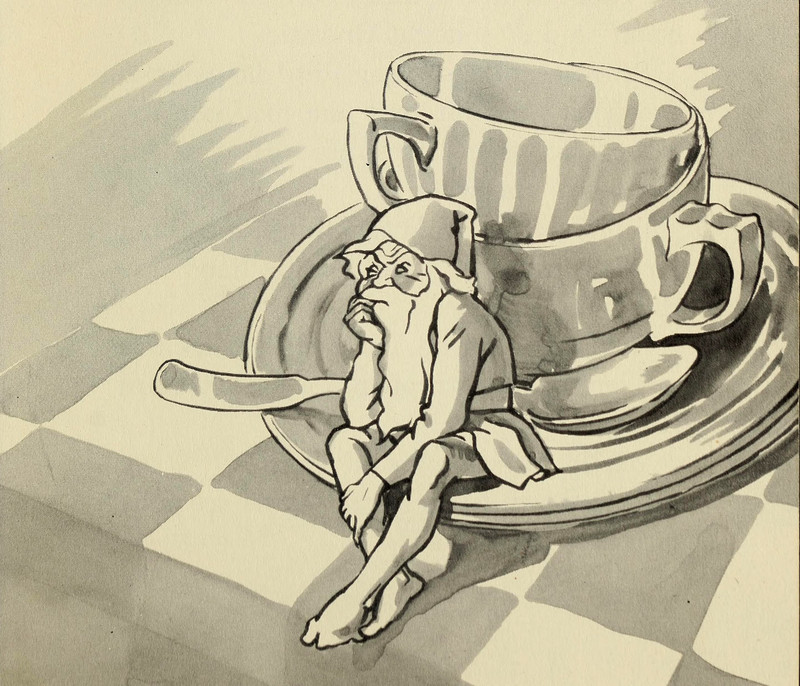 #vintage illustration #gnome #elf #brownie #illustration #teacup