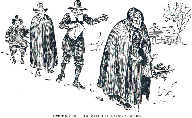 An illustration from Bill Nye's History of the United States (1894).  The caption reads: "Opening of the witch-hunting season."
