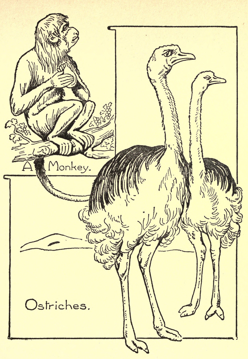 #vintage illustration #monkey #ostrich #illustration