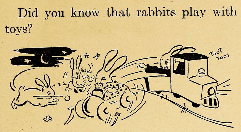 "Did you know that rabbits play with toys?"  From The Canadian Pupil's Own Vocabulary Speller Grade 2 by Gates et al., 1947.