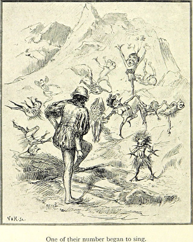 An illustration from Phantastes: A Faerie Romance by George MacDonald (1894).  The caption reads: "One of their number began to sing."