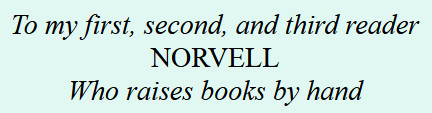 It was five of a November afternoon, crisp and sharp, and already running into dusk. Down the street came a girl and a dog, rather a small girl and quite a behemothian dog. If she had been a shade smaller, or he a shade more behemothian, the thing would have approached a parody on one's settled idea of a girl and a dog. She had enough height to save that, but it was the narrowest sort of squeak.[Bonus: The dedication from a different book by this author.]