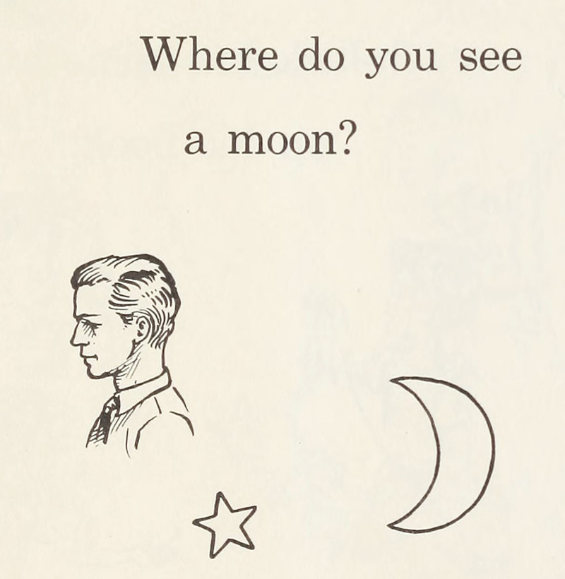 "Where do you see a moon?"  From Practice For Jack and Janet Primer by McKee, Harrison, McCowen & Lehr, 1957.