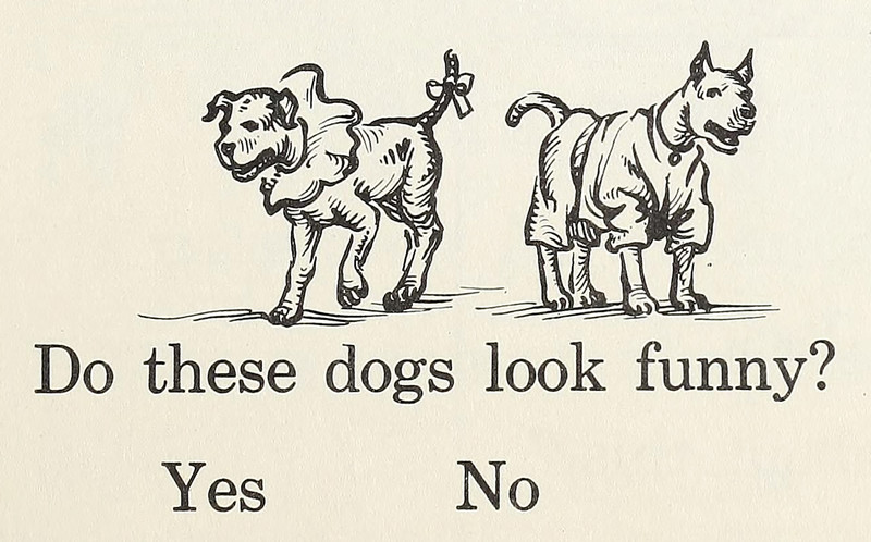 "Do these dogs look funny?"  From Practice For Jack and Janet Primer by McKee, Harrison, McCowen & Lehr, 1957.