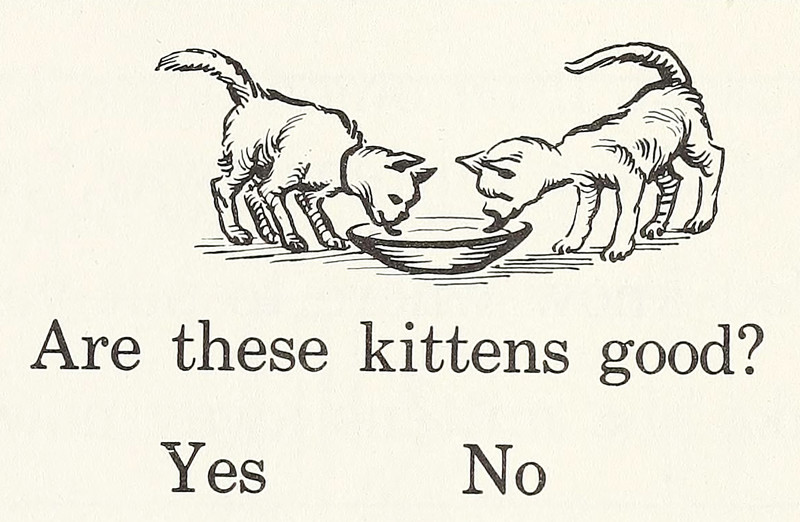 "Are these kittens good?"  From Practice For Jack and Janet Primer by McKee, Harrison, McCowen & Lehr, 1957.