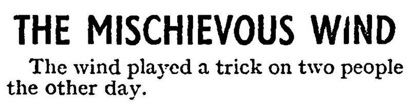 "The mischievous wind.  The wind played a trick on two people the other day."  From The Children's Newspaper, 1938.