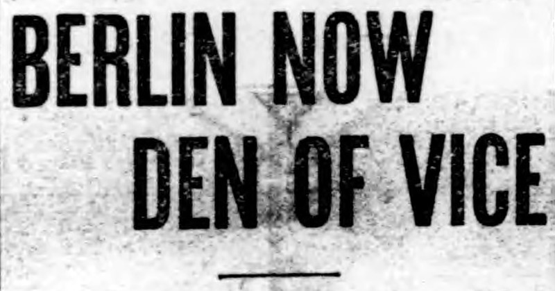 "Berlin now den of vice."  From the Duluth Herald, 1914.