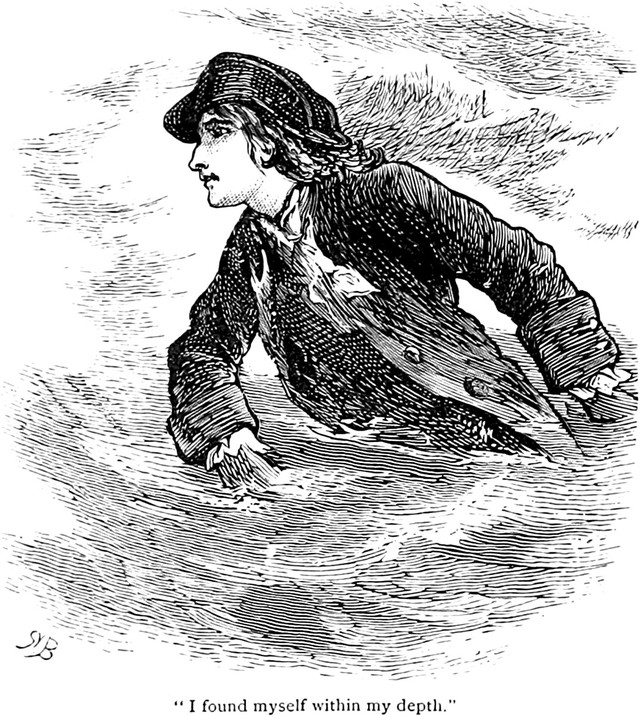 An illustration from Gulliver's Travels.  The caption reads: "I found myself within my depth."