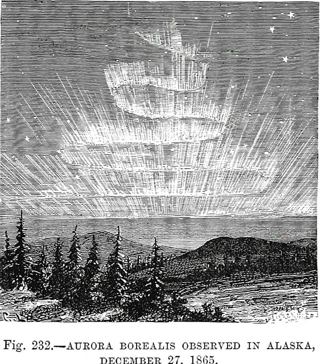 An illustration from Our Earth and Its Story by Robert Brown (1893).  The caption reads: "Fig. 232 — Aurora borealis observed in Alaska, December 27, 1865."