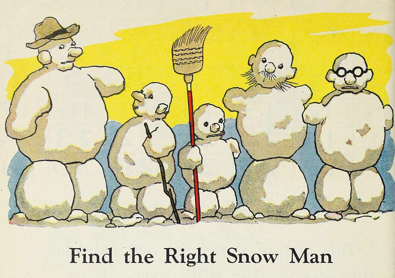 "Find the right snow man."  From Number Stories Book 2 by Studebaker, Findley, Knight & Gray, 1942.