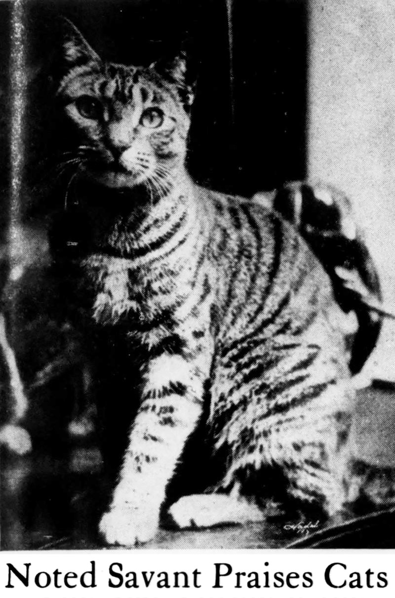 "Noted savant praises cats."  From the Massachusetts Society for the Prevention of Cruelty to Animals' Our Dumb Animals, 1940.