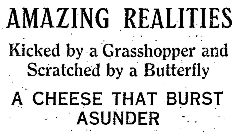 "Amazing realtites.  Kicked by a grasshopper and scratched by a butterfly.  A cheese that burst asunder."  From The Children's Newspaper, 1923.