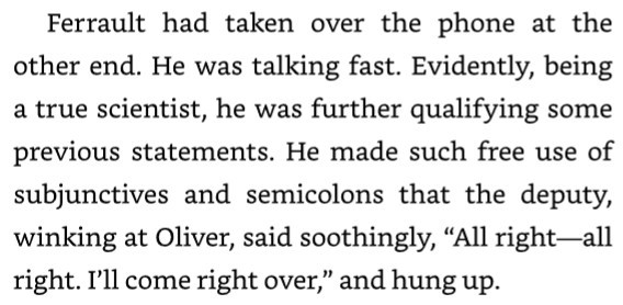 ***Jaffray nodded, his eyelids closing and opening with the bobbing of his head like those of a mechanical doll tipped over backward.***"It's a dud....It hasn't any 'it.'"***It was the same blank wall--only blanker now, with the peculiar insistence of its own iteration.[Bonus: "illegible roads" (i.e., roads made difficult to follow due to inclement weather).]
