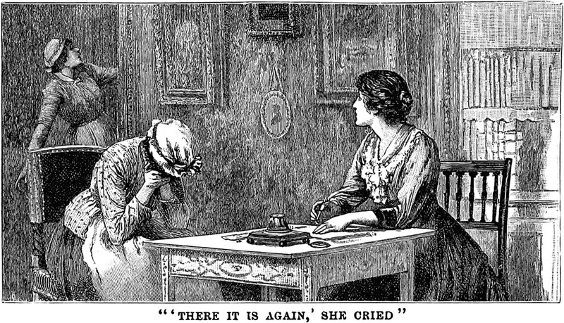 An illustration from Under a Strange Mask by Frank Barrett (1890).  The caption reads: "'There it is again,' she cried."