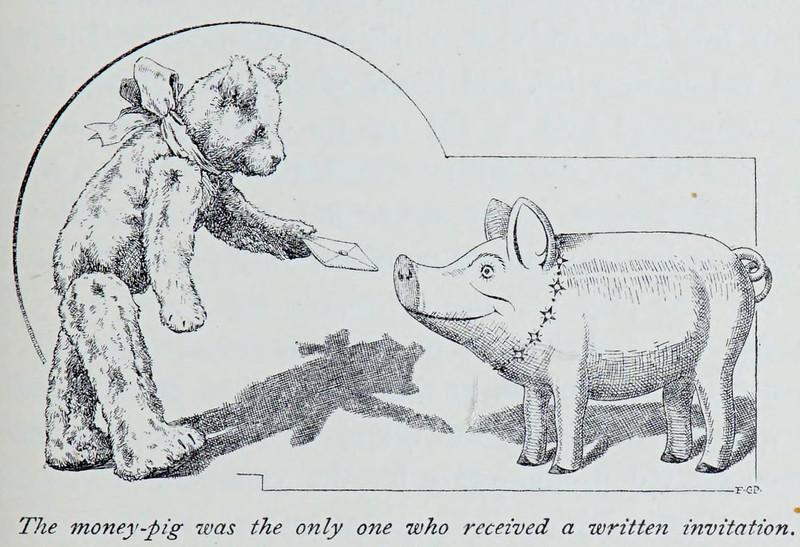 #vintage illustration #fairy tale #teddy bear #piggy bank #pig #illustration #1910s #liiving toy