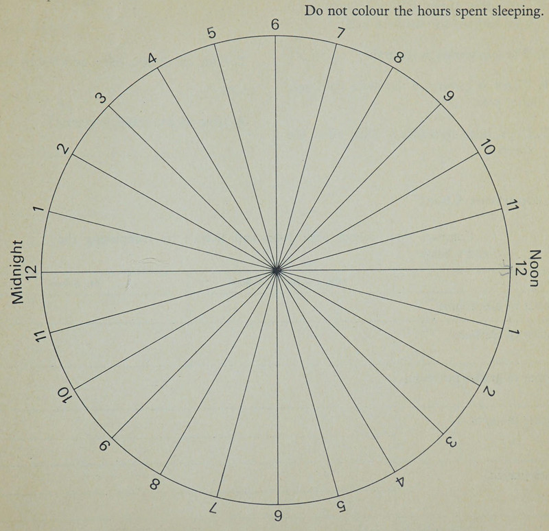 "Do not colour the hours spent sleeping."  From Workbook for Around Our World by Donald Massey, 1965.  Related: The Minimalist Coloring Book.