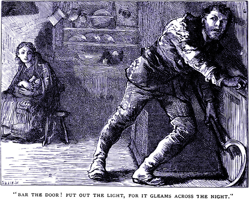 An illustration from Illustrated British Ballads: Old and New by George Barnett Smith (1886). The caption reads: "Bar the door! Put out the light, for it gleams across the night."