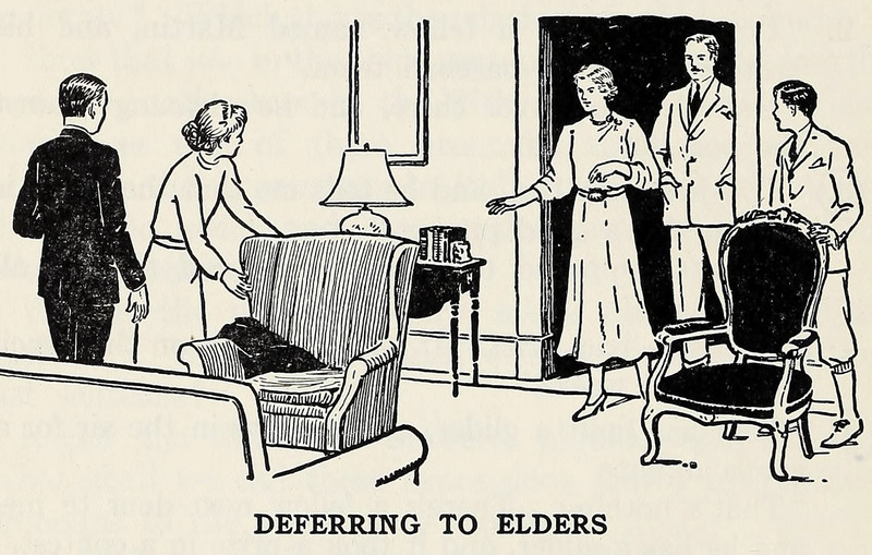 "Deferring to elders."  From Junior English Activities Book Three by Hatfield, Lewis, Besig & Borchers (undated, c. 1938).