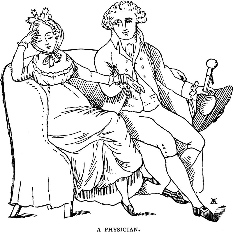 A prerequisite to a physician's bedside manner is a love seat manner. From Social England Under the Regency by John Ashton (1890). The caption reads: "A Physician."