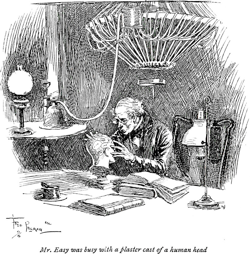 An illustration from Mr. Midshipman Easy by Frederick Marryat (1896).  The caption reads: "Mr. Easy was busy with a plaster cast of a human head."