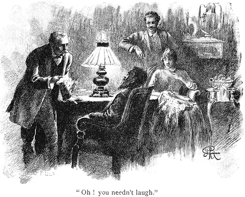 An illustration from The Conquest of the Moon by Andre Laurie (1889).  The caption reads: "Oh! you needn't laugh."