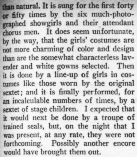 ***To hear Miss Kelly's singing voice is more fully to understand her great success in pantomime. [Dorothy Parker]***a desert scene, of course, with the good old Sphinx on the backdrop [Parker]***[All the attachments are also Parker, with the exception of the one about the "O O"--which in context clearly means the "once-over," i.e., scanning someone's appearance from head to toe. I love the way it evokes eyes!]