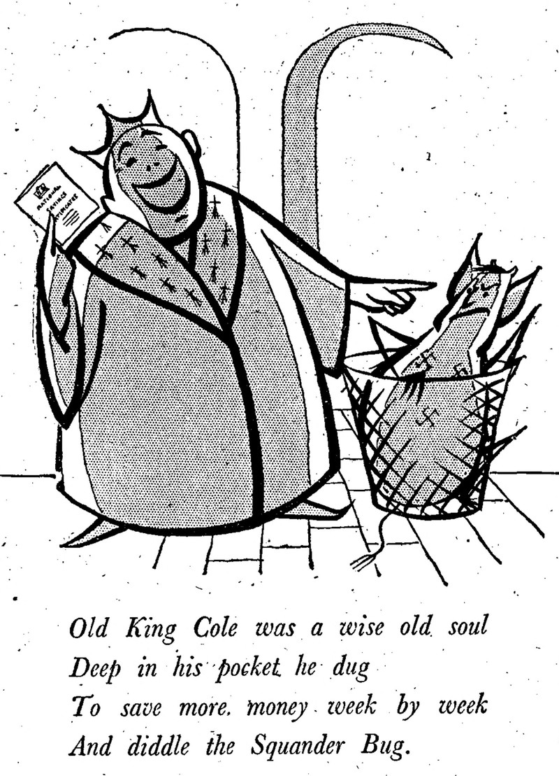 "Old King Cole was a wise old soul / Deep in his pocket he dug / To save more money week by week / And diddle the Squander Bug." From The Children's Newspaper, 1945.